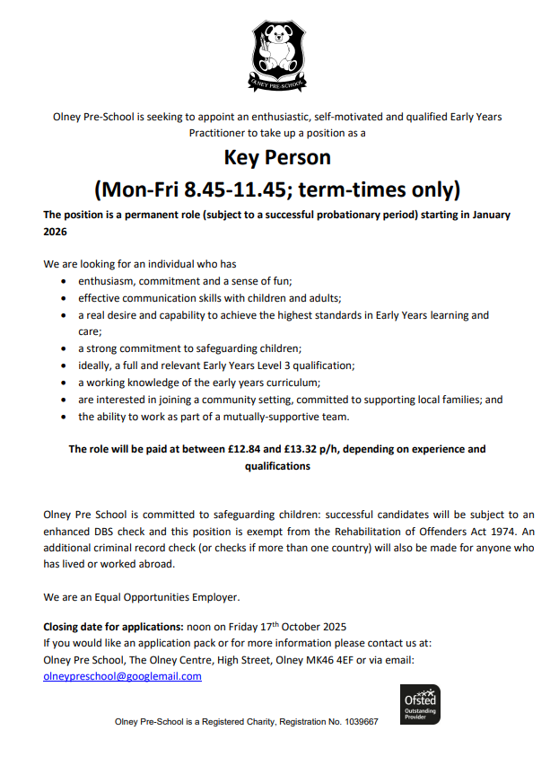 Please note that this page is not regularly updated – to see our current news, please visit our Facebook page https://www.facebook.com/people/Olney-Pre-School/100057613772954/ where we keep you up to date with our recent activities.